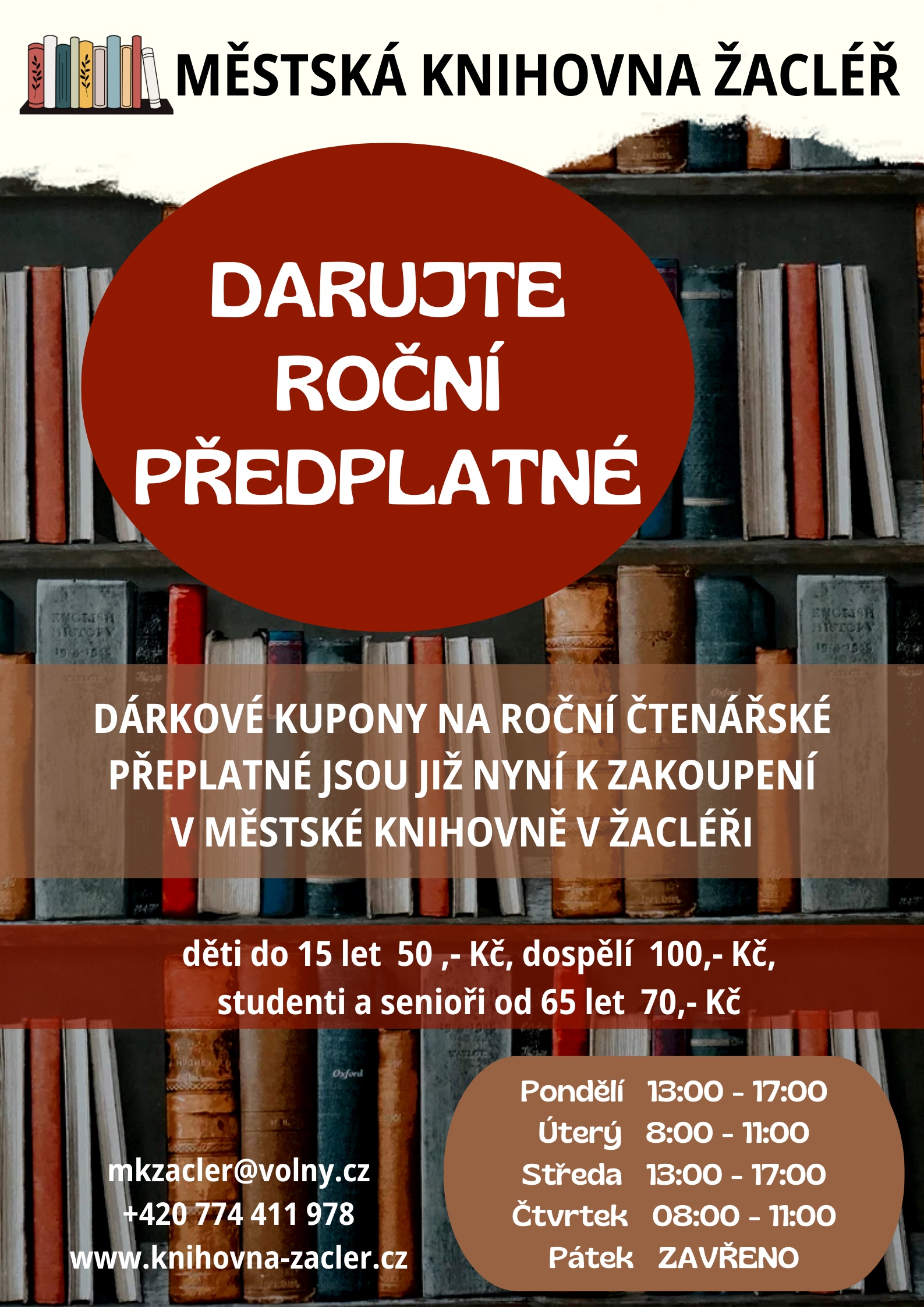 Nevíte jaký originální dárek pro nejbližší k Vánocům? Pořiďte jim roční předplatné do knihovny, cena je symbolická. Pro nové čtenáře vytvoříme nový čtenářský průkaz. Pro všechny věkové skupiny tu čekají každý měsíc novinky různých žánrů.